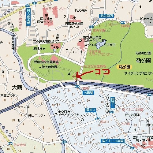 ちょっと呼びかけが急になってしまいましたが、やりませんか? 猛暑猛暑と言われ、トロケてしまいそうに暑い日が続きますが、だからこそあえて運動していい汗かかない? とりあえず水分補給は欠かさないように…。 成城学園前駅前(少しくだって行ったところローソンの目の前)からバスが出てます。区立総合運動場下車です。バスを降りたら目の前にコートがあります。東急バスで都立01(都立大北口行き)です。 この地図のマーク上に、コートがあって、その目の前がバス停です! 遊びなので服装は動きやすければ何でも結構です。 時