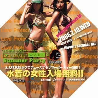 いよいよ夏! LUIREが贈るUNDER WARE 第1弾Summer Partyはbaby shoopとのコラボで 水着パーティー♪ 水着の女のコは入場無料! さらにドリンクまでついちゃう!! リゾートの雰囲気いっぱいのフロアには セクシーなshoopの水着を着たParty Up Dancersが 狂喜乱舞!!! ジャマイカ、ブラジル、、、 トロピカルリゾートへ一晩だけのショートトリップ☆ 女性専用ロッカー&ラウンジスペース、 ヘアアレンジ&ネイルブースもあり! フロアでとびきりセクシーに輝いたLUIRE GIRLSには shoopより水着をプレゼント♪