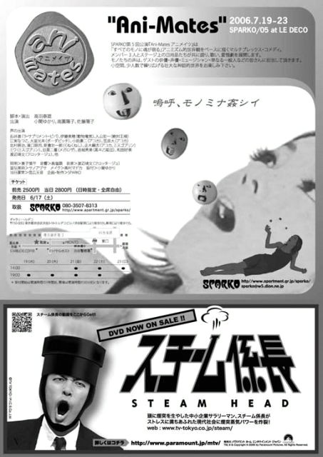●スケジュール 7/19(水)19時 7/20(木)19時 7/21(金)14時・19時 7/22(土)14時・19時 7/23(日)14時 ●前売2500円、当日2800円 ↓HP。こちらに予約フォームがございます。 http://www.apartment.gr.jp/sparko/ ↓SPARKOコミュニティー。 http://mixi.jp/view_community.pl?id=195962 〜嗚呼、モノミナ姦シイ〜 SPARKO第5回公演『Ani-Mates アニメイツ』は 「全てのモノに魂が宿る」というアニミズム的世界観を ベースに描くマルチプレックス・コメディ。 メンバー3人とステージ上の日用品