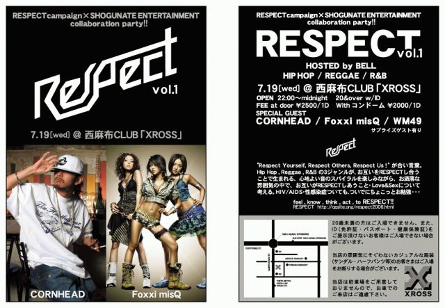 一枚のCD「STOP AIDS CLUB MOVEMENT」が生んだ出会い。 熱い男B-freshのBELLさんとRESPECT Campaignが 完全コラボで実施するクラブイベントの記念すべき第1回。 お洒落なお店で、お洒落な音楽。 飲んで、踊って、楽しもう! ☆★☆★☆★☆★☆★☆★☆★ RESPECT Campaign × SHOGUNATE ENTERTAINMENT collaboration party!! 『RESPECT vol.1』 ★☆★☆★☆★☆★☆★☆★☆ “Respect Yourself, Respect Others, Respect Us!”が合い言葉。Hip Hop, Reggae, R&Bの3ジャンルが、お互いをRESPECTし