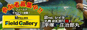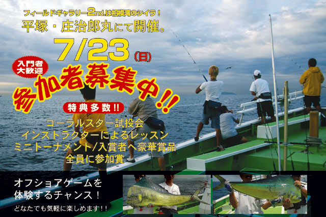 只今、参加者募集中! 開 催 日 時 2006年7月23日(日) AM5:00〜PM3:00 開 催 場 所 相模湾 平塚 船宿・庄治郎丸 http://www.shojiromaru.com/ 〒254-0803 神奈川県平塚市千石河岸57-16 TEL:0463-21-1312 案内地図 参 加 費 男性 ¥10,000 女性 ¥6,500 (乗船料・傷害保険料・ドリンク代を含む)※当日会場にてお支払いください。 イベント内容 (予 定) 及び 参加者特典 パームス・コーラルスター・ドルフィンクラス ロッド試投会 インストラクターによるレッスン ミニトーナメント(入賞者には豪華賞品を贈