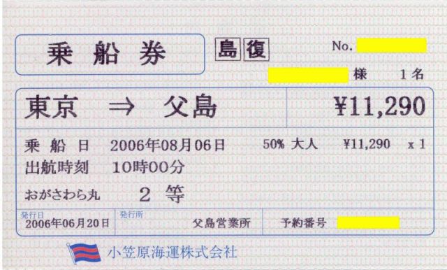 これは父島から内地へ行く(帰る)便です。 最終日までビッシリ楽しんで、お疲れかとは存じますが、道中宜しくお願いいたします。 ワタク氏が乗るおが丸は、まず「揺れない」ので、ご安心ください。文字通り、大船に乗った気分に浸れるかと思います。ただし、全く揺れない船はありません。揺れの体感具合は個人差が御座いますので、予めご了承くださいませ。(笑) 写真の切符はワタク氏の帰りの分です。この便に乗って父島へ行かれる方も、別のイベントで募集しておりますので、併せてお願いいたします。
