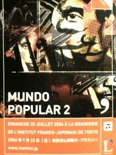ワールド・ミュージックの持つポピュラリティーをより多くの皆様に。 日仏学院のラ・ブラスリーという異国情緒に溢れる空間を国境を自由に飛び越えた音楽で満たします。 [Mundo Popular 2] 7月23日(日)16:00−21:30 東京日仏学院内ラ・ブラスリー(http://www.institut.jp) DJs: 成田佳洋(NRT / Samba Nova) 稲葉昌太(Rip Curl Recordings / Inpartmaint) 中橋ゆかり(Ahora Corporation) 佐々木俊広(Intoxicate / nmnl) 関根繁樹(Drink 'Em All) ロブ Rob Holbrook (el gringo) 伊藤亮介(大洋レコード) LIVE Performanc