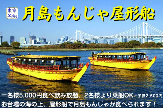 トキオです。 今回はさとみからの企画提案です。 題して 「夏だ!浴衣だ!もんじゃだ? in 東京湾」 もんじゃと言えば月島ですが、その月島もんじゃ協会が屋形船もんじゃを運営してます。 屋形船に乗って東京湾の夜景を楽しみながら、もんじゃ、お好み焼き食べ放題の飲み放題を満喫しようと。 どうせ屋形船に乗るのなら、さらに雰囲気を味わうためにも服装は浴衣、甚平でってことで、持ってる人は是非ここで披露しましょう。 以下募集詳細 ================================= 開催日:2006年7月23日(日) 時 間:19:15時間