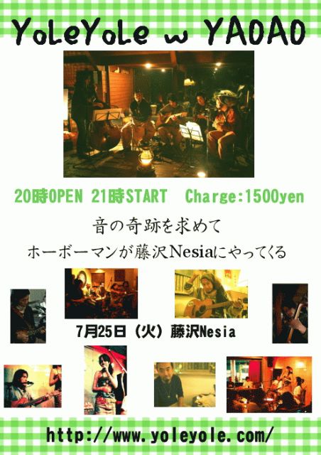 7/25 (火) fujisawa Nesia Presents 『YoLeYoLeYAOAO伝説』 Open:20時 START:21時 Charge:1500 〜〜YoLeYoLe(http://yoleyole.com/)〜〜 nao(うた) Ryuji(マンドリン・バンジョー) Kouhei(ギター) の3人からなるアクースティックユニット。 ブルーグラスから日本の古いフォークソング、 レゲエに子守唄。いろんなジャンルの音楽をYoLeYoLeカラーに 染めあげ、オリジナルを交えながらの各地でのライブは老若男女問わず みんなに大人気。七月には東海地方10箇所を回るツアーもあり おじいちゃんから子供たちまでゆっくり