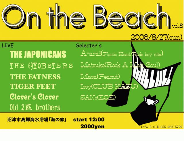 2006/8/27(sun) 今年でナント、8回目になります!! って事は、一回休みにしたから、一回目から9年経ちます 沼津市島郷海水浴場 海の家 ¥2000 12:00 START LIVE ★THE 69YOBSTERS http://homepage.mac.com/nuttyskins/BoO/HARDSTOMPER69.htm ★THE JAPONICANS http://www.medianetjapan.com/2/19/music_audio/japonicans/top.html ★THE FATNESS http://ip.tosp.co.jp/i.asp?i=fatness80 ★TIGER FEET ★Clover's Clover http://sound.jp/clovers/ ★Old2匹http://hpcgi2.nifty