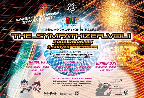 浜松ロックフェスティバル in PALPAL The SYMPATHIZER Vol.1 あの遊園地パルパルで音楽の祭典!! 真夏の1日を遊んで踊ろう! 2006年8月5日 (土曜日) 開場 午前9時 開演 午後1:00 終演 午後9:00 入場券 3,500yen (1Drink / 乗り物券5回分付き) 主催 studio-SYMPATHY 企画 SPIRUTUAL BANQUET of SOUND 協力 SONIC SYSTEM / PIONEER / MIGHTY ROOTS MESSENJAHS 音響 SONIC SYSTEM / 松尾音響 TRANCE DJ's SHIVATRANCE PSYN NOHA RiN Spread REGGAE DJ's ROOTS MAN TR-I FALCONSCIOUS RA