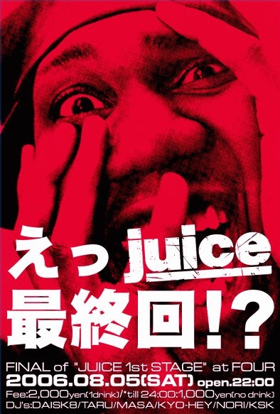 「JUICE 1st STAGE FINAL」 DJs:DAISK8/TARU/MASA/KYO-HEY/NORI/KSK OPEN 22:00 Door 2000yen/1drink Till 24:00 1000yen/no drink fourコミュ → http://mixi.jp/view_community.pl?id=320382 ************************************************** 「DAISK8コメント」 2004年1月、当時の静岡では珍しかったマンスリーのレギュラーパーティとしてスタートして2年半。 HIP HOPを通じて音楽の素晴しさ・無限の可能性、クラブの楽しさを表現しようと頑張ってきました。 この2年半、多くのアーティストとも共演出