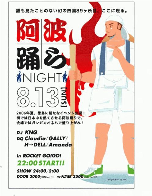 誰も見たことのない幻の四国89ヶ所目、ここに現る。 *** gay mix *** venue : ROCKET GO!GO! OPEN : 22:00~ SHOW : 24:00/2:00 DOOR : \3000 (1D) / \2500 (wf/1D) DJs: KNG(PANDORA/tottori) YOKO-SAN(explosion/kagawa) DRAG QUEENs:Elmore/Claudia/GALLY/Amanda/Candy* Dance unit: CROSS-FADE ...and GO-GO BOY:ta-bo(hiroshima) ww 2006年夏、四国徳島に新たなPARTYが開かれる! その名も【阿波踊らNIGHT】!! 夏夜を揺るがす阿波踊りの熱気で火照ったカラダを、 突き上げるサウンドとパフォー