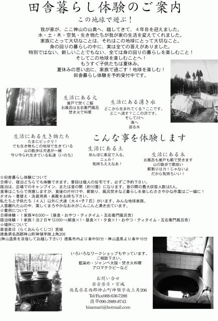 我が家が、ここ神山の山奥へ、 越してきて、4年目を迎えました。 水・土・木・空気・生き物たちが 我が家の生活を変えてくれました。 家族にとって大切なことは、 それはこの地球にとって大切なこと。 身の回りの暮らしの中に、 実は全ての答えがありました。 特別ではない、新しいことでもない、 全ては身の回りの暮らしを楽しむこと! そしてこの地球を楽しむことへ! もうすぐ子供たちは夏休み。 夏休みの思い出に、家族で過ごす!地球を楽しむ! 田舎暮らし体験を予約受付中です。 ☆こんな事を体験します! 釜戸で焚くご飯・