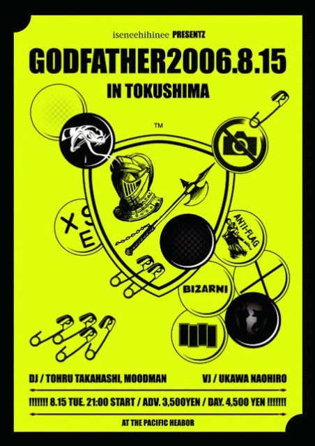 阿波踊りのミッドナイトダンスパーティー開催!!! iseneehihinee presents ■「GODFATHER IN TOKUSHIMA」 ----"SUPER-FREE breaked out of prison tour 2006!!!!!!!" GODFATHER IN AWA DANCE FESTIVAL!!!!!!!!!!!!!!!!!!!!!!! 2006/08/15(tue) open/start 21:00〜04:00 @THE PACIFIC HARVER・1F ADV : 3500YEN(1D) / DAY : 4500YEN(1D) 出演 : DJ / TOHRU TAKAHASHI .MOODMAN VJ / UKAWA NAOHIRO http://friendick.jp/weblog/2006/07/god_father.html 伝説のディープ・ハウス・パーティ"GODFATHER"が