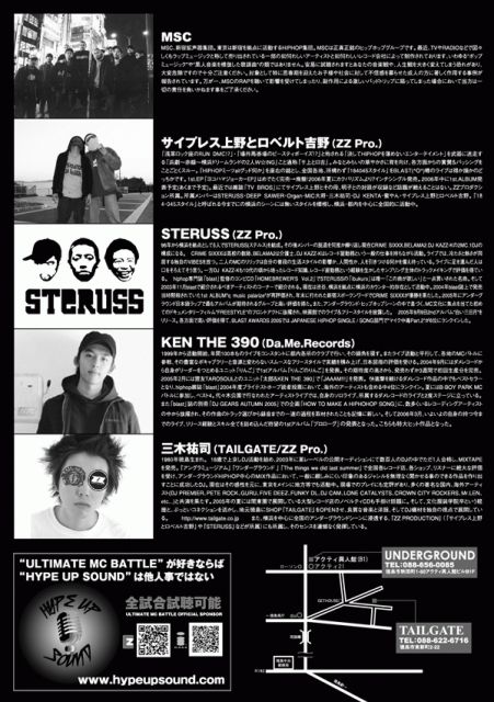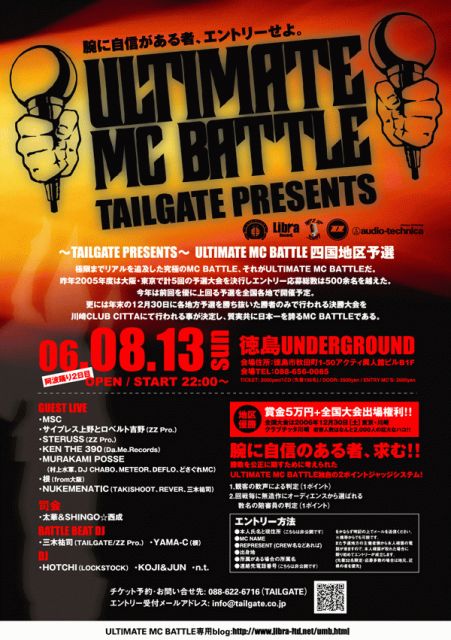 ■■■■■■■■■■■■■■■■ 〜TAILGATE PRESENTS〜 ULTIMATE MC BATTLE 四国地区予選 ■■■■■■■■■■■■■■■■ 会場: 徳島UNDERGROUND 会場住所: 徳島市秋田町1-50アクティ異人館ビルB1F 会場TEL: 088-656-0085 日時: 2006/8/13 22:00〜 TICKET: 2000yen/1CD(先着100名) DOOR: 2500yen ENTRY MC'S: 2000yen [GUEST LIVE] MSC サイプレス上野とロベルト吉野(ZZ Pro.) STERUSS(ZZ Pro.) KEN THE 390(Da.Me.Records) MURAKAMI POSSE(村上水軍、DJ CHABO、METEOR、DEFLO、どさぐれMC) 根(from大阪) NUKEMENATIC(TAK