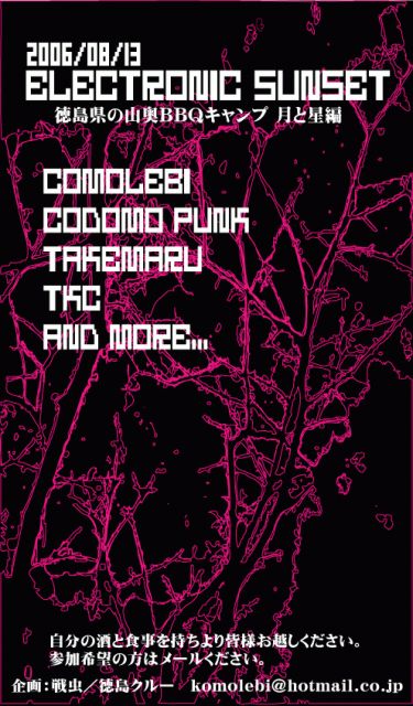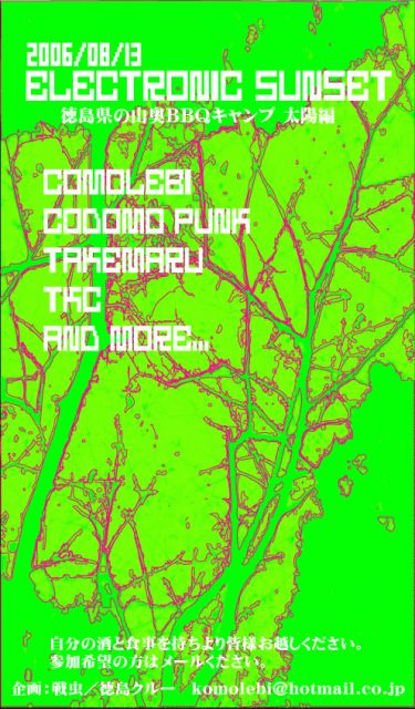 12日から15日の間は世界最高を誇るレイブの一つ阿波踊りがあります。が夜10時くらいには終わってしまいます。そのテンションの開放の場にはこれしかない! 8月13日 徳島の山奥BBQパーティ ELECTRONIC SUNSET 太陽編、月と星編の二部構成 おそらくエレクトロニックな一日になるでしょう。 LIVE&DJで踊り狂いましょう! COMOLEBIは今回、ライブで宇宙旅行へ連れて行くよ。 本物のUFOがくるかも! そのほかの出演者も続々と決まっています。 全体的にジャンルはクラブ系アンダーグラウンド全般 です。 徳島が誇るク