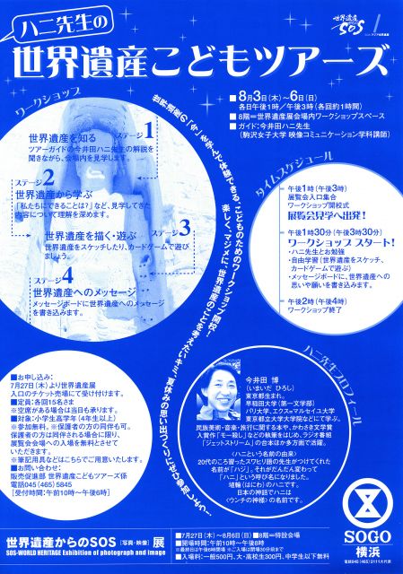 ハニ・ツアーズの詳細が決まりました。 ハニが旗を持って15人の小学校高学年以上の子供たちをガイドして、 世界遺産や危機遺産の写真展会場をご案内します。 危機遺産に関しましては、90秒のビデオ映像も放映しています。 最初に写真展をツアーして回り、 ワークショップに戻って世界遺産の絵を描いたり、 〈世界遺産カード〉で遊んだりします。 ワークショップには〈子供の時間〉の看板が出ているはずです。 保護者の方も、お子さま連れでツアーズに参加していただければ入場料の500円が無料になります。 楽しくやりましょう! よろしかっ