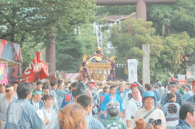 玉と孔雀の二基の大神輿が二十三ヶ町を練り、 お旅所「姥が森弁天」へ渡御し、 稲毛神社へと帰ってきますを