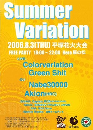 Free Party Start 18:00〜 ◆LIVE◆ ■Colorvariation http://www.colorvariation.com ■GreenShit ◆DJ◆ ■Akion(HRC) ■Nabe30000 ◆SOUND◆ ■Captain Bob(HEVENS DOOR) ◆DECO◆ ■BAMBOO PROJECT JAPAN ◆SK8◆ ■MO3 Store ◆Special Thanks◆ ■日球ドームテント *花火大会が雨天中止の場合は、PARTYも中止となります。 *花火大会の影響で道路が混雑しています。お車でのご来場はご遠慮ください。(駐車場は用意してありません) *ゴミは必ず各自で持ち帰りましょう。 *会場にはBARが出店されてい