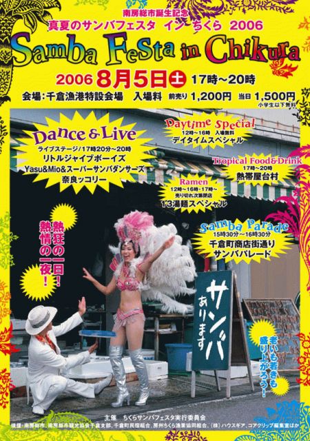 老いも、若きも楽しもう! 「ちくらのサンバ」今年も元気に開催! ★真夏のサンバフェスタ イン ちくら2006★ 8月5日(土)17時〜20時 会場:千倉漁港特設会場 入場料:前売 1200円 当日 1500円 小学生以下無料 ◆12時〜16時/【デイタイムスペシャル】 千倉漁港特設会場/入場無料 ◆15時30分〜16時30分/【千倉町商店街・サンバパレード】 千倉町中央商店街通り (千倉橋交差点から館信千倉支店まで) ◆17時00分〜20時00分/【メインステージ】 千倉漁港特設会場 出演者:奈良ッコリー/リトルジャイ
