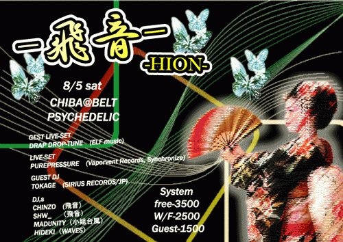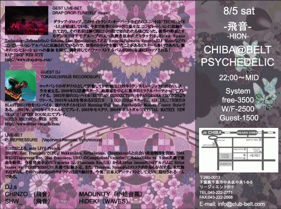 PSYCHEDELIC fee:FREE -3500 W/F -2500 GUEST-1500 GUEST LIVE-SET ■DRAP DROP−TUNE (ELF music) LIVE-SET ■PUREPRESSURE (Vaporvent Records,Synchronize) GUEST DJ ■TOKAGE (SIRIUS RECORDS/JP) DJ’s: ■CHINZO(飛音) ■SHW_ (飛音) ■MADUNITY(小姐台風) ■HIDEKI(WAVES)