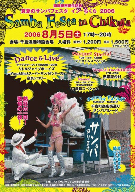 ♪ことしもサンバがやって来る! *南房総市誕生記念* ★★★真夏のサンバフェスタ イン ちくら 2006★★★ ●と き:8月5日(土)17:00〜20:00 ●ところ:千倉漁港特設会場(南房総市千倉町) ◎入場料:前売券1,200円 当日券1,500円 小学生以下無料 駐車場完備 ★★Main Stage★★ ラテンで盛り上がる!真夏のライブ 開場=17:00 開演=17:20〜20:00 <出演>リトルジャイブボーイズ ☆藤井康一(ヴォーカル、ウクレレ、テナーサックス) ☆照本 史(キーボード) ☆恵福浩司(ベース) <特別参加> ☆田中倫明(