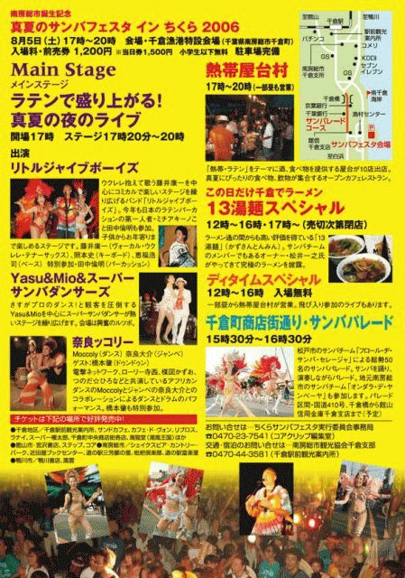 ♪ことしもサンバがやって来る! *南房総市誕生記念* ★★★真夏のサンバフェスタ イン ちくら 2006★★★ ●と き:8月5日(土)17:00〜20:00 ●ところ:千倉漁港特設会場(南房総市千倉町) ◎入場料:前売券1,200円 当日券1,500円 小学生以下無料 駐車場完備 ★★Main Stage★★ ラテンで盛り上がる!真夏のライブ 開場=17:00 開演=17:20〜20:00 <出演>リトルジャイブボーイズ ☆藤井康一(ヴォーカル、ウクレレ、テナーサックス) ☆照本 史(キーボード) ☆恵福浩司(ベース) <特別参加>