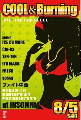 8月5日 土曜日 OPEN 22:00 at CLUB INSOMNIA 1500YEN(1dr) Withフライヤー1000YEN(1dr) DJ ICE CLIMBAE chi-ka ファイト中西 yossy FRESH High Kick TEN-TEN (HIP HOP R&B REGGE HOUSE andmore!?)