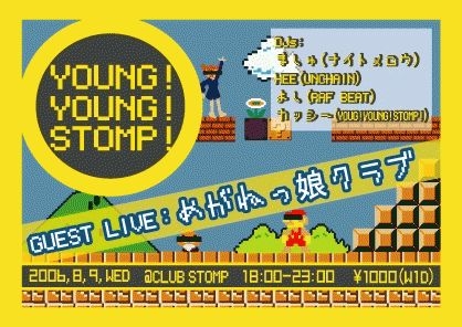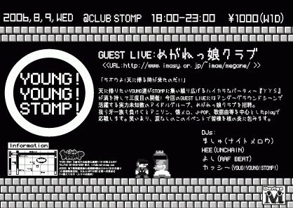 「YOUNG!YOUNG!STOMP!」 2006年8月9日 @CLUB STOMP 1000YEN(W/1D) 18:00-23:00 GUEST LIVE めがねっ娘クラブ DJ ましゅ(ナイトメロウ) HEE(UNCHIN) よし(RAF BEAT) カッシー(YOUNG!YOUNG!STOMP!) 「ラオウよ!天に帰る時が来たのだ!!」 天に帰りたいYOUNG達がSTOMPに集い繰り広げるハイカラなパーティー『YYS』が満を持して三度目の開催! 今回のGUEST LIVEにはアンダーグラウンドシーンで活躍する実力未知数のアイドルグループ、めがねっ娘クラブを招聘。我ら牙一族も負けじとアニソン、懐メロ、J-PO