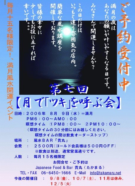 今回で7回目となる満月風水イベント。 満月の日は開運しやすくなるということで BARにて風水プチセミナーを行っております。 PM8:00〜 PM10:00〜の2回説明タイムがありますが 飲食に関しては通常通りです。 本当に風水の効果を得るために必要な条件のお話。 間取りの鑑定とは一味違った内容です。 ぜひご参加ください。 参加費 2500円 (貴丸会員様もしくはmixiからのご予約の方は参加費500円OFF) 参加人数 限定オ15名(先着順) 当日は意味あってキャンドルの明かりのみで営業します。