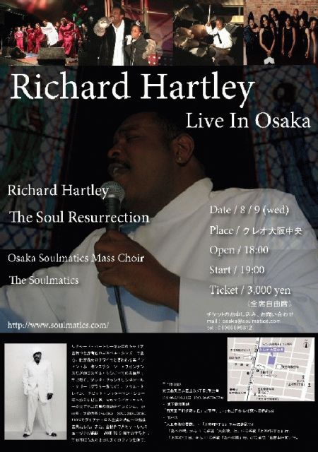 あの全世界で大ヒットしたミュージカルMAMA I WANT TO SINGの主役としても知られる、 25年のキャリアを持つ世界有数のゴスペルシンガーRICHARD HARTLEY、 そして彼の率いるTHE SOUL RESURRECTIONが大阪に来日します!! ●Date/2006/8/9(WED) ●Open/18:00 Start/18:30 ●Ticket/3,000 yen ●Place/クレオ大阪中央 〒 543-0002 大阪市天王寺区上汐5丁目6番25号 TEL 06-6770-7200 FAX 06-6770-7705 ●アクセス 地下鉄谷町線「四天王寺前夕陽