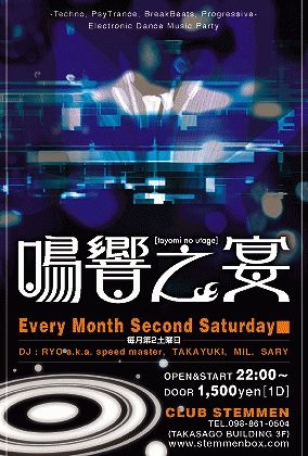 ■鳴響之宴 -toyomi no utage- Techno, PsyTrance, BreakBeats, Progressive Electronic Dance Music Party 日時/8月12日(土) START/22:00〜 場所/CLUB STEMMEN (TAKASAGO BUILDING 3F) MAP : http://ic33.mixi.jp/photo/bbs/29/30/9392930_48.jpg ※今回は3Fでの開催です。 料金/¥1,500 (1D) ■DJ RYO a.k.a. speed master TAKAYUKI MiL SARY