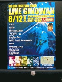 宜野湾市「はごろも祭り」と同時開催される「ライブ ギノワン2006」今年も若手グループ10バンドが出演 (入場無料) 例年多数の応募があり今年は45組みのバンドがエントリーした。 沖縄のヤングミュージックの息吹をたっぷりとどうぞ! 隣の他目的広場は「はごろも祭り」が13日まで 行われます。(カチャーシー大会は13日)無料