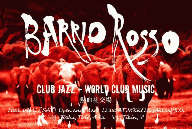 今週土曜日8月12日10時から! ---- BARRIO ROSSO ---- BARRIO ROSSO [バリオロッソ] 地下への階段を降りると、架空の街「BARRIO ROSSO」へと繋がる。 アラブ、インド、ラテン、ジャズがクラブ音楽へと融合した音楽が響き、VJが作り上げた映像が空間を彩る。 Barrio RossoではFuture Jazz, Broken Beats, World Club music (Hip Hop, Drumn'N'Bass, House, Dubと融合された音楽)をお届けします。 1,000yen/1D open-9:00pm start10:00pm DJ : Toshi, Tino, A-Ta VJ : Tikin, P @熱血社交場