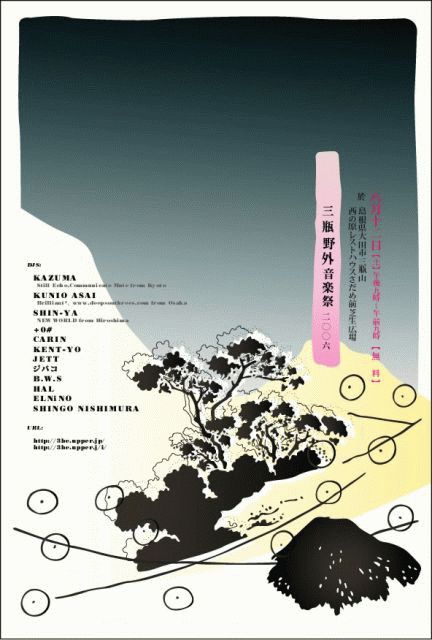 三瓶野外音楽祭2006 date:2006.8.12 sat PM9:00〜AM9:00(雨天決行) place:島根県大田市 三瓶山西の原 レストハウス西の原前 芝生広場 charge:無料!!!! DJ's: KAZUMA (Still Echo,Communicate Mute from Kyoto) KUNIO ASAI(Brilliant*、www.deepsouthrecs.com from Osaka) SHIN-YA (NEW WORLD from Hiroshima) +0# CARIN KENT-YO JETT ジバコ B.W.S HAL ELNiNO SHINGO NISHIMURA ...and more? SOUNDSYSTEM:REDALERT url:http://3be.upper.jp/ コミュ:http://mixi.jp/view_community.pl?id=24264