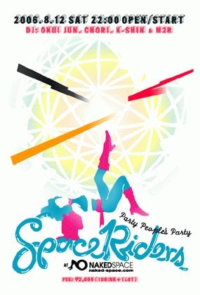 またまたパーチーピーポーのためのパーチー♪♪♪ [ SPACE RIDERS ] DATE: 2006.8.12 SAT OPEN/START: 22:00 VENUE: NAKED-SPACE ( http://www.naked-space.com ) DJ: OKUI JUN, CHORI, K-SHIN & M2R FEE: 2000YENw/1d + 1lot 夏休みもあとわずか、っていう落ち込みもこのパーティーに来ていただければ、そ、お得な遊びがこんなとこに!なんていう発見もありありのSPACE RIDERS 8月編。今月もお腹いっぱいなDJMIXX、何杯でもいけそーなサマーカクテル、友達の友達はみな友達だ!フレーフレー!す・も・も的な内容でありとあら