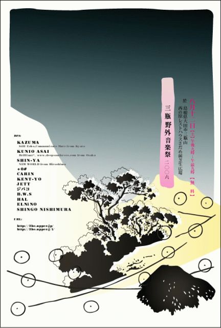 三瓶野外音楽祭2006 date:2006.8.12 sat PM9:00〜AM9:00(雨天決行) place:島根県大田市 三瓶山西の原 レストハウス西の原前 芝生広場 charge:無料!!!! DJ's: KAZUMA (Still Echo,Communicate Mute from Kyoto) KUNIO ASAI(Brilliant*、www.deepsouthrecs.com from Osaka) SHIN-YA (NEW WORLD from Hiroshima) +0# CARIN KENT-YO JETT ジバコ B.W.S HAL ELNiNO SHINGO NISHIMURA ...and more? SOUNDSYSTEM:REDALERT url:http://3be.upper.jp/ コミュ:http://mixi.jp/view_community.pl?id=242646 map:http://3be.up