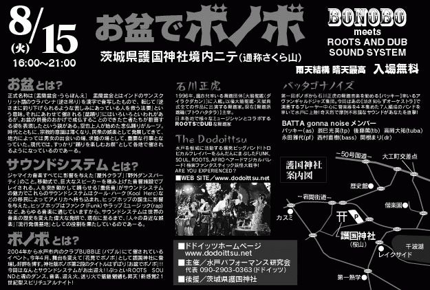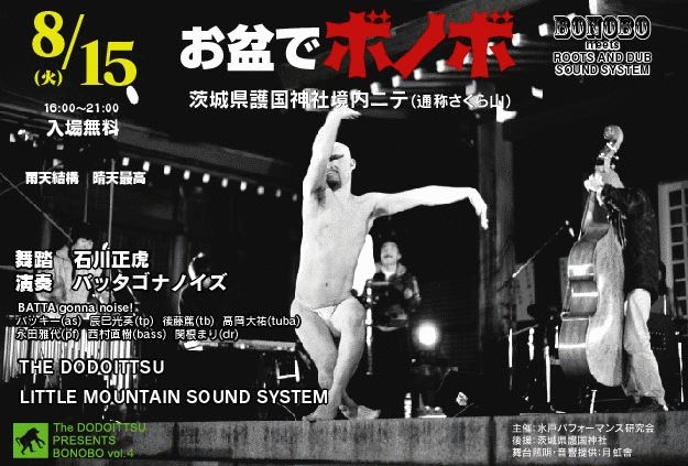 8月15日、茨城県護国神社(通称さくら山しあわせの杜)にて、「お盆でボノボ」という野外ライブイベントが催されます。 出演者は舞踏パフォーマンスに大駱駝鑑の舞踏家、石川正虎氏。舞踏演奏はバッタゴナノイズ。バッタゴナノイズのメンバーは「渋さ知らずオーケストラ」のメンバーを中心に管楽器4本を集めた7人編成の本格的バンド。水戸から出演するバンドは「ドドイッツ」 音響システムに、巨大なスピーカーを積み上げたジャマイカ発祥のサウンドシステムを用意し、1970年代のジャマイカンミュージックが境内に流れます。 境内には当日