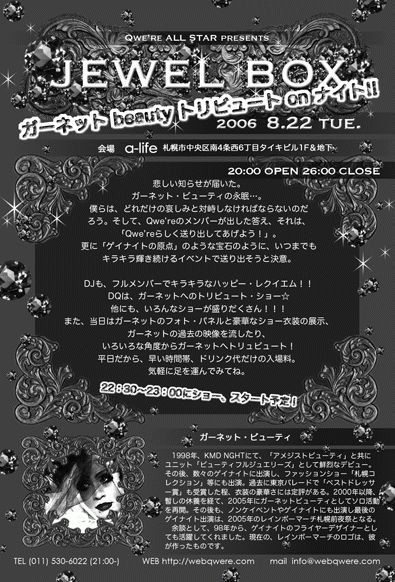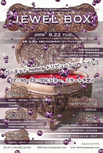 -QWE'RE ALL STAR PRESENTS- □□□ JEWEL BOX □□□ -ガーネットbeauty トリビュート on ナイト!!- *** MIX EVENT *** 2006 / 08/ 22 (TUE) 会場 : a-life 札幌市中央区南4条西6丁目タイキビル1F & 地下 open : 20:00- close : -26:00 1,000yen / Door & W (2drink order) ■ DJs & VJ FMFC / MOSH / TOSHI / YOSHICO TOHRU ■ PERFORMANCE SHOUJI ■ GOGO BOY & HONEY GIRL MASASHI / HIROSHI / YOSHIHISA / SHOU JUN JUN ■ DQs ベロニカ・ドロシー・