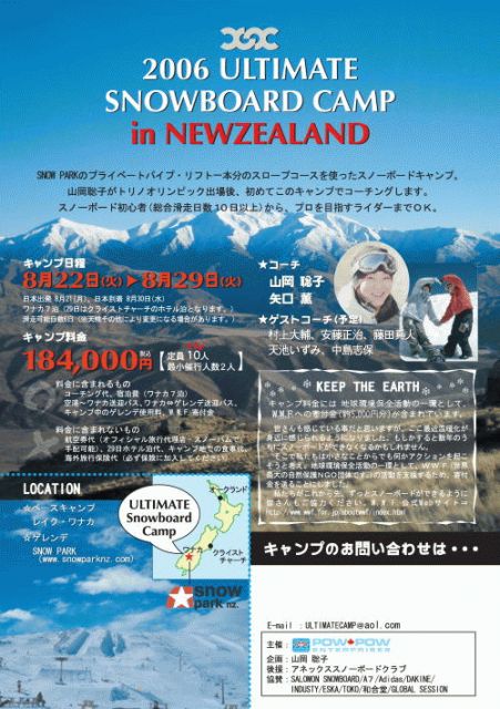 今ニュージーランドで一番熱いゲレンデSNOW PARKで パーク&パイプのエキスパートがコーチングするスノーボードキャンプ。 ・海外でスノーボードをしてみたい人 ・キッカーを始めたばかりの人 ・パイプに挑戦してみたい人 ・初心者の人 みんな大歓迎です。 【コーチ】 山岡聡子 矢口"ヤグカオ"薫 村上"ダイキ"大輔 安藤正治 藤田"ブシ"真人 天池いずみ 中島志保 詳しくはキャンプホームページをご覧ください⇒ http://www.annexsc.jp/Soko/USCamp/usc-index.html