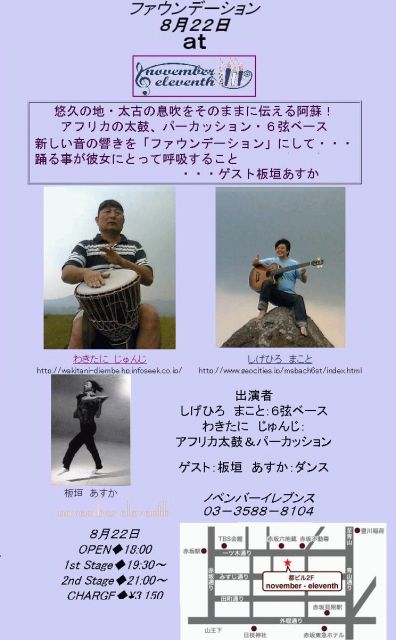 ノベンバーイレブンス 03−3588−8104 8月22日 出演者 しげひろ まこと:6弦ベース わきたに じゅんじ: アフリカ太鼓&パーカッション ゲスト:板垣 あすか:ダンス OPEN◆18:00 1st Stage◆19:30〜 2nd Stage◆21:00〜 CHARGE◆\3,150 http://wakitani-djembe.hp.infoseek.co.jp/3-8/inv8-22.htm