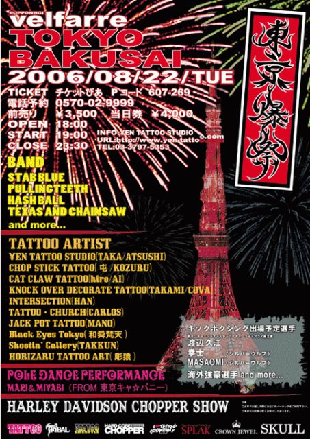 UNDERGROUND MIXING EVENT 東 京 爆 祭 in velfarre 開催 8月22日(火) OPEN18:00 START19:00 CLOSE23:30 開催場所:東京都港区六本木ベルファーレ (http://velfarre.avex.co.jp/index.html) ■KICK BOXING インターナショナル女子ムエタイ前チャンプの渡辺久江 (http://ameblo.jp/hisae-blog/) 拳士(シルバーウルフ)、 MASAOMI(シルバーウルフ) 他海外強豪選手らによる特設リングでのキックボクシングエキシビジョンマッチ。 ■ROCK BAND LIVE STAB BLUE (http://www.stabblue.com/) PULL