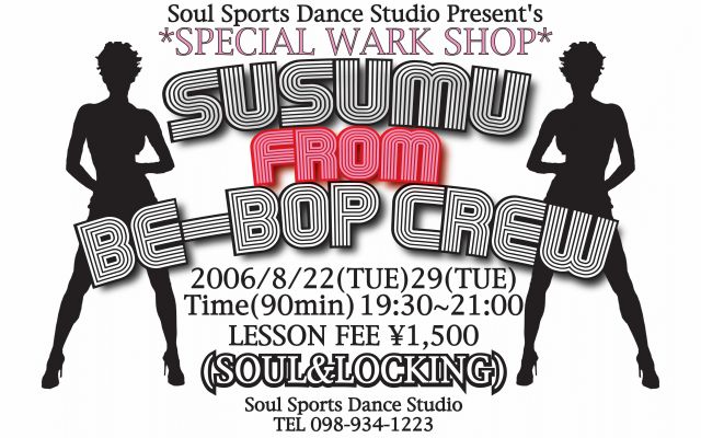 管理人さんスミマセン告知させて頂きます! 8/22(火)にワークショップを行います! あの日本を代表する福岡が誇る BE-BOP CREWのSUSUMUさんが沖縄に2週間滞在します! そこで、Soul Sports Dance Studioでワークショップを 行います! 来年で結成25周年を迎えるにあたり、絶対受けましょう! 必見です! システムは¥1500です!(90分) かなり格安です! ジャンルはLocking&Soulです! 日 :2006年8月22日(火)、29日(火) 時間:19:30〜21:00 場所:Soul Sports Dance Studio(沖縄) お問い合わせ:098-934-1223(18:00~