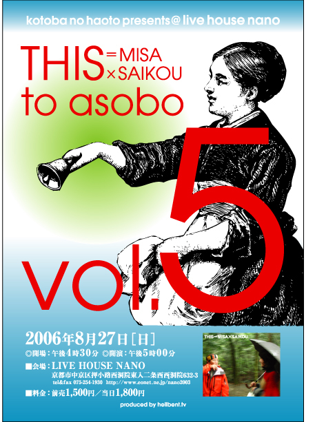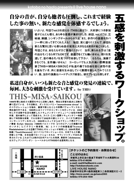 来月、8/27(日)にlive house nanonにて 【THIS TO ASOBO vol.5】を開催します。 バイオリンとピアノの即興音楽家『THIS=MISA×SAIKOU』を 講師として招き、音の鳴るモノを持参して来て頂いたお客さんと チェーン・インプロビゼィションという方式をとりながら一つの音を形成していき、新たな意識が芽生えるこのイベント。 早いもので、もう5回目です。 お陰さまで回を重ねるうちに参加者の数も増え、それに伴ない、普段、見れない楽器も増え、毎回、本当に楽しくて有意義なイベントとなってきました。 しかし、次回の【THI
