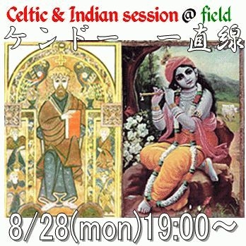 ━━━━━━━━━━━━━━━━━━━━━━━━━━━ 2006年8月28日(月) 19時〜 ♪ Celtic & Indian fusion ケンドー 一直線コンサート ♪ 京都irish pub field ━━━━━━━━━━━━━━━━━━━━━━━━━━━ 【時】2006年8月28日(月) 19時〜21時 【ところ】京都烏丸 irish pub field http://www.geocities.jp/kyotofield/ 【出演】 hatao :アイリッシュフルート Nantha Kumar:タブラ、ガタム、ガンジーラ 赤澤淳:ブズーキ 【料金】入場無料、