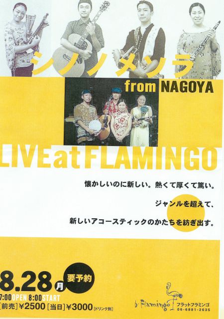 シノノメソラ from NAGOYA 懐かしいのに新しい。熱くて厚くて篤い。 ジャンルを越えて、 新しいアコースティックのかたちを紡ぎ出す。 ■会場 フラットフラミンゴ(南森町) 大阪市北区天神橋3-12-14 2F TEL:06-6881-2635 ■時間 8月28日(月曜日) OPEN 19:00 START 20:00〜 ■料金 前売り \2,500/当日 \3,000 (ドリンク別) ■ご予約・お問い合わせ フラットフラミンゴ TEL:06-6881-2635 ※25名様限定です。 ※完全予約制。