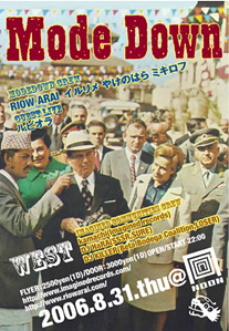 2006.08.31.thu. Mode Down WEST @ Osaka NOON open/start22:00~ : flyer2500(1d)/door3000(1d) - ModeDown Crew - Riow Arai / イルリメ / やけのはら / ミキロフ - Guest Live - ルビオラ - Imagined Communities Crew - Kamachi(Imagined records) / DJ HaRA(SSSR,SURE) / DJ KILLER(Beta Bodega Coalition,LOSER) 今年もやります、夏休み最後のプレゼント、モードダウン、再び西へ!