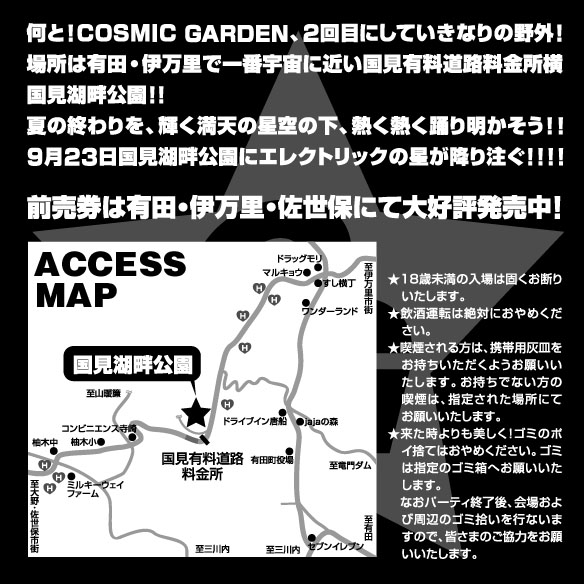 9月23日(土)野外イベントのご案内です。 第1回目のパーティでは異常な盛り上がりで 最後まで途切れる事なくフロアを沸かせ続けた COSMIC GARDENが 満を持して2回目のパーティを開催します! しかもまだ2回目というのにいきなり野外! 場所は有田・伊万里で一番宇宙に近い場所を!ということで 国見有料道路料金所横の国見湖畔公園です!! 夏の終わり・秋のはじまりを、 輝く満天の星煌めく空の下で、 熱く熱く踊り明かそう!! 9月23日国見湖畔公園にエレクトリックの星が降り注ぐ!!!! ★