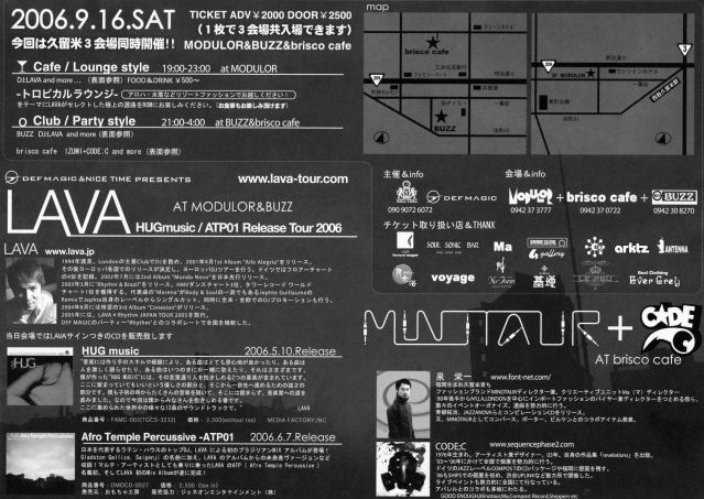 ☆★☆【NICE TIME】☆★☆ 今回の会場は久々の久留米。3会場同時開催で大人のDJ EVENTやっちゃいます。特に19時からのMODULORはお食事なんかも出したりして新感覚のPRATY STYLEでやっちゃいます!!! HP: http://nicetime.sub.jp/ TIME:2006.09.16(土)  PLACE:MODULOR&BUZZ&brisco cafe(福岡県久留米市) TICKET:ADV\2.000- DOOR\2.500-(3会場共通チケット制で1枚で全ての会場に入場出来ます。) GUEST: ・DJ:LAVA:http://www.lava.jp/index.html ・DJ:IZUMI(MINOTAUR):http://www.font-net.com/ ・LIVE PA