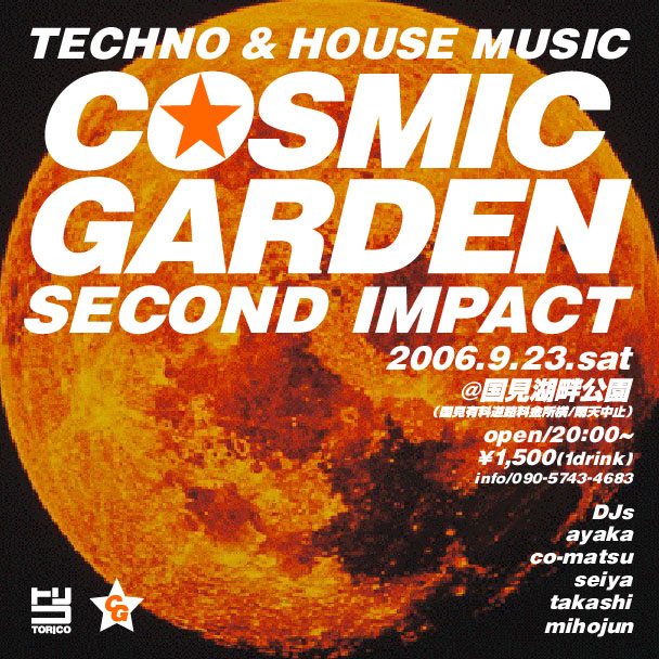 国見湖畔公園にやぐらを組み、DJブースを作り ドリンクバーを設けて、星の綺麗な公園で 夏の〆そして秋の夜長イベントをお届けします! コズミックのスペシャルDJ達の音を聴きながら 酒を飲むもよし、踊るもよし☆ ラーメン食らうもまたヨロシ! モチロン星を見上げるもよし、まったりするのもよし! 好き勝手遊んでって下さい! 最高のロケーションと最高の音を保障します。 COSMIC GARDEN SECOND IMPACT (コズミックガーデン) 2006.9.23.sat @国見湖畔公園(国見有料道路料金所横/雨天中止) op
