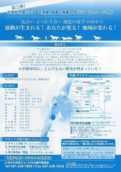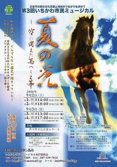 第3回いちかわ市民ミュージカル 『夏の光〜空に消えた馬〜』 市川を中心とした子どもと大人総勢300人。三世代市民にによる、生演奏、感動と衝撃のオリジナルミュージカル!! あらすじ: 中山競馬場のファミリーデイの平和な光景。 たくさんの観衆の中に松丸家族もいる。 突然、ギャンブル・オタクの兄をおそう馬の亡霊たち。 馬に変身した兄を追って、家族は、60年前の市川にタイム・スリップ! そこには幼い頃の祖父の姿が…、そして少年の愛した農耕馬「朝風」が…。 昭和20年5月、戦争に勝つために