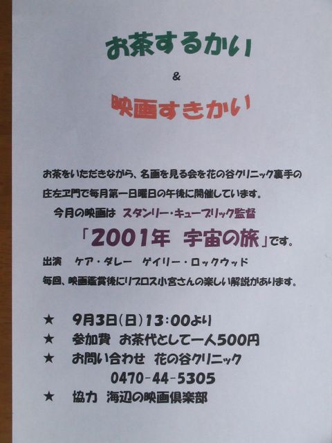 千倉の皆さん 「お茶する会 映画する会」という楽しい会が毎月あるのをご存知ですか? 千倉町白子にある「花の谷クリニック」裏手にある 古民家「庄左ヱ門」で映画付きのお茶会やってます。 80インチの大画面で上映します。 毎月第一日曜日 ☆9月3日 13:00より ☆お茶代500円 ☆問い合わせ先 花の谷クリニック 0470−44−5305