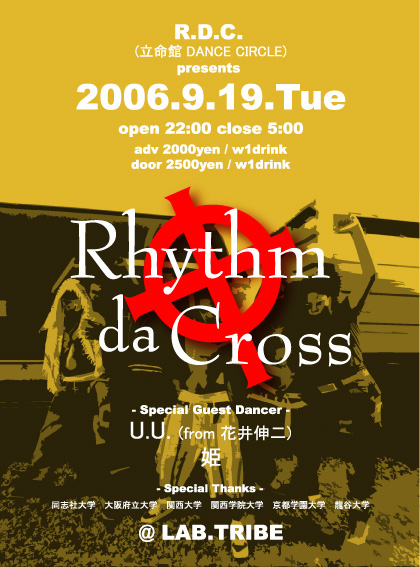 ついについに!!! RDC4期生による、初の試み!! GUEST、MC、PICK UPダンサー、他大学からのTEAM、 そしてレペゼンRDCのメンバーたちのTEAM。。 今回はホンマにやばい!!! いつものアットホームなイベント『Street Flavor』とは一味ちがう。 9月19日(TUE) Rhythm da Cross@LAB.TRIBE(京都河原町二条) OPEN 22:00〜5:00 SPECIAL GUEST DANCER: U.U(花井伸二)、姫 Pick up DANCERS: Ladwick BLOOM+ジュンヤ -N-cleus+RIKIYA from MAD NUT'$ Rythm Vibration BraVoa